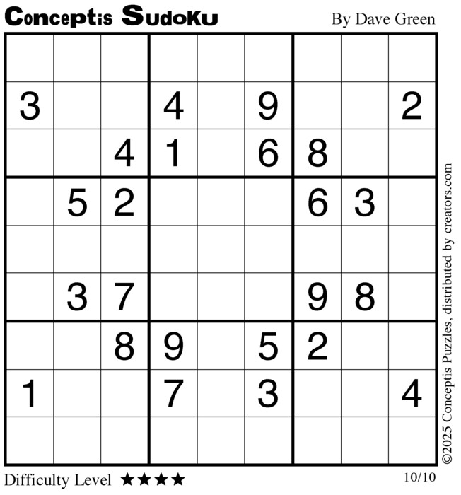 Each puzzle consists of a 9x9 grid containing given clues in various places. The object is to fill all empty squares so that the numbers 1 to 9 appear exactly once in each row, column and 3x3 box.